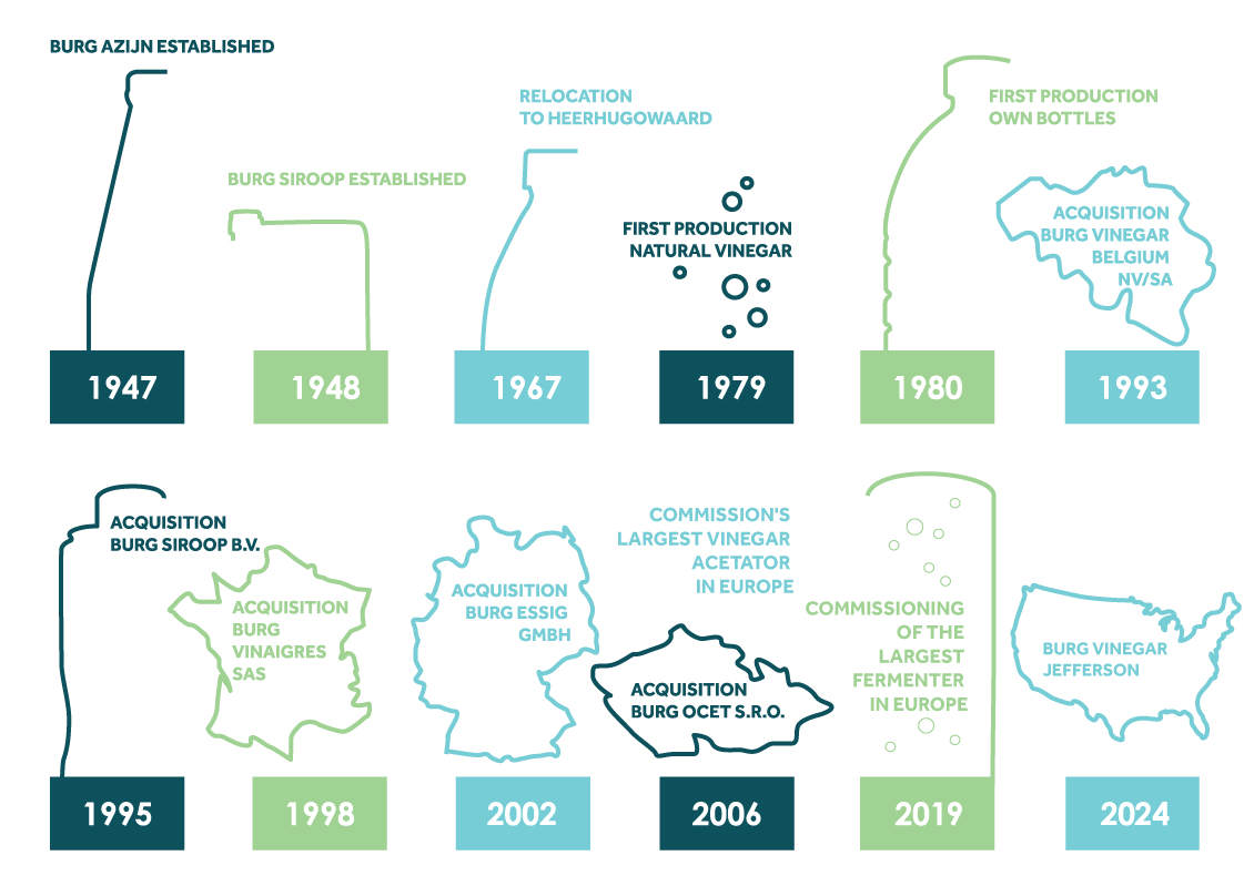 In the subsequent decades, the company experienced turbulent growth, partly due to its hunger to expand and the extension of the product portfolio. In 1948, Bakker launched its syrup production. The natural vinegar production was added in 1979 under the inspiring leadership of Piet Hein Bakker, Cees’ son, who took over at the helm in 1969. While he was director, the company continued to grow autonomously and there were more acquisitions. These acquisitions resulted in expansion abroad and the extension of the range and brand portfolio. Burg now has production locations in Belgium, Germany, France and the Czech Republic, besides the site where it all began in Heerhugowaard (the Netherlands). The syrup factory is in Ter Aar in the Netherlands. All the locations are now known under the flag of the Burg Group, i.e. Burg Azijn, Burg Siroop, Burg Vinegar Belgium, Burg Vinaigre France, Burg Ocet and Burg Essig. Per 2024 Burg Vinegar Jefferson is also part of the Burg family.